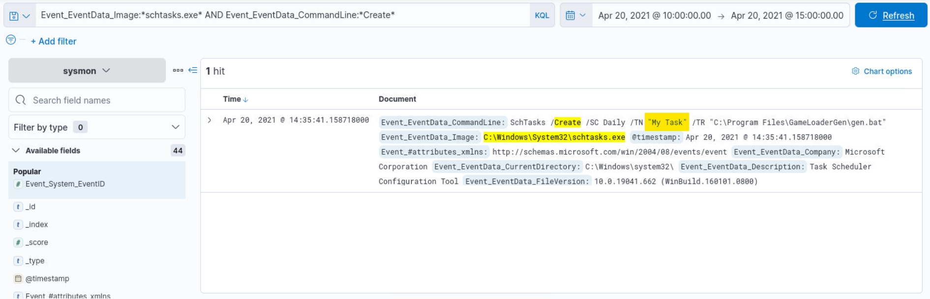 . Sysmon Event ID 13 records the registry value modifications. Within the Event_EventData_TargetObject field, at the very end we can see the suspicious executable: