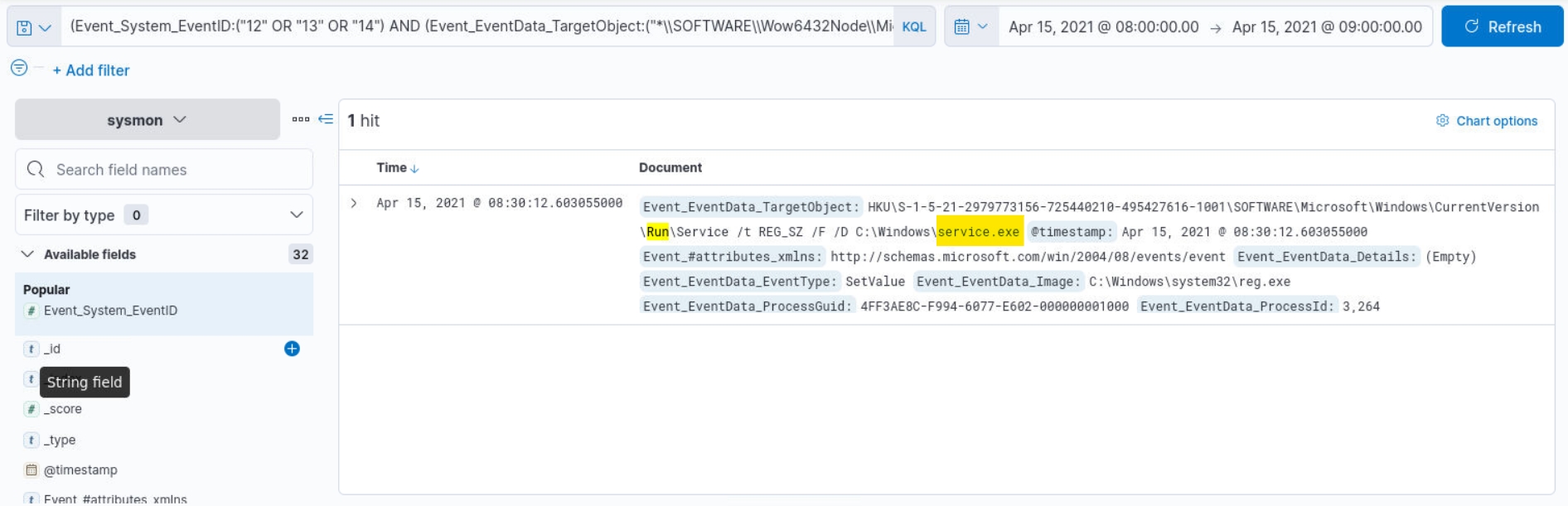 To see the logs that triggered the Alert 3 we need to filter for (Event_System_EventID:("12" OR "13" OR "14") AND (Event_EventData_TargetObject:("*\SOFTWARE\Wow6432Node\Microsoft\Active